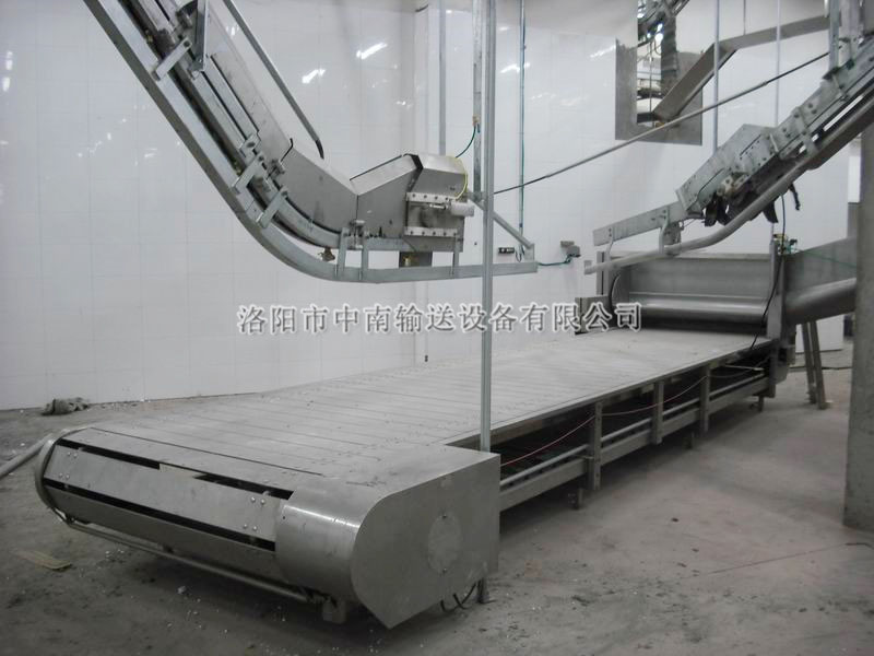 平板輸送機:該機用于麻電后的牲豬輸送, 上掛至放血線的配套設備。該機主要由機架、電機、減速機、板鏈、鏈輪,拖輥等部件構成,具有結構簡單、運轉平穩,維修方便等優點。是大、中型屠宰加工廠不可缺少的設備。